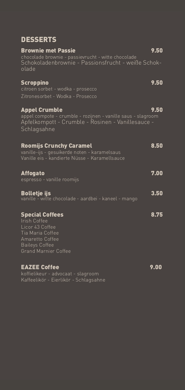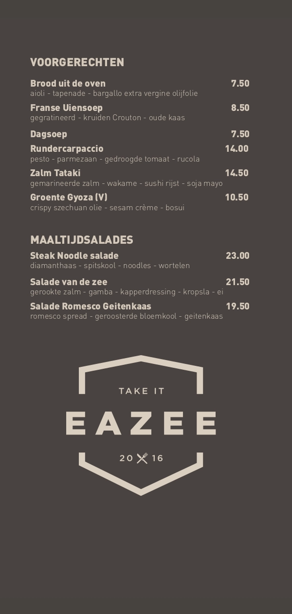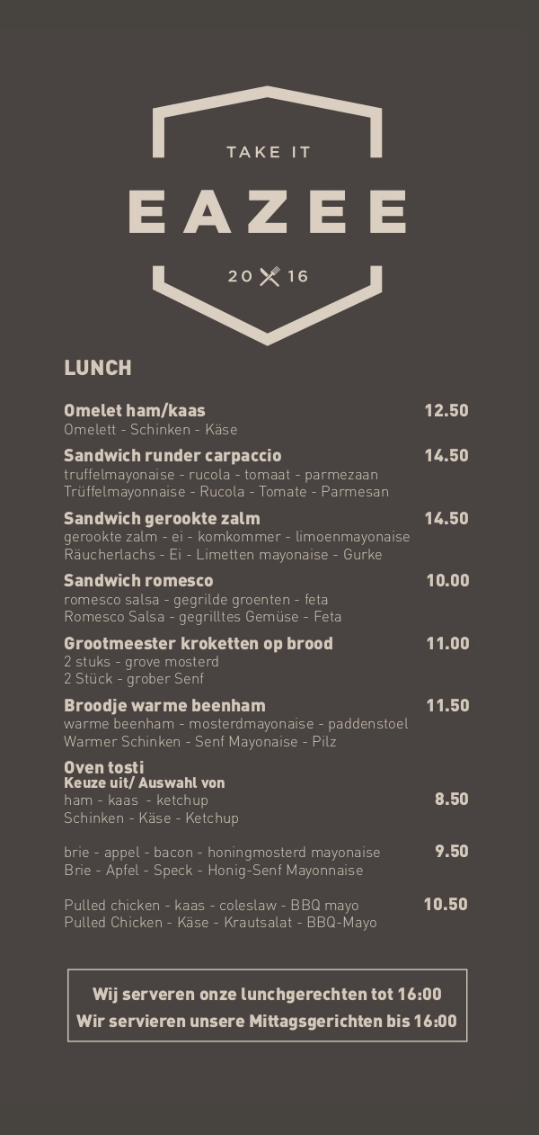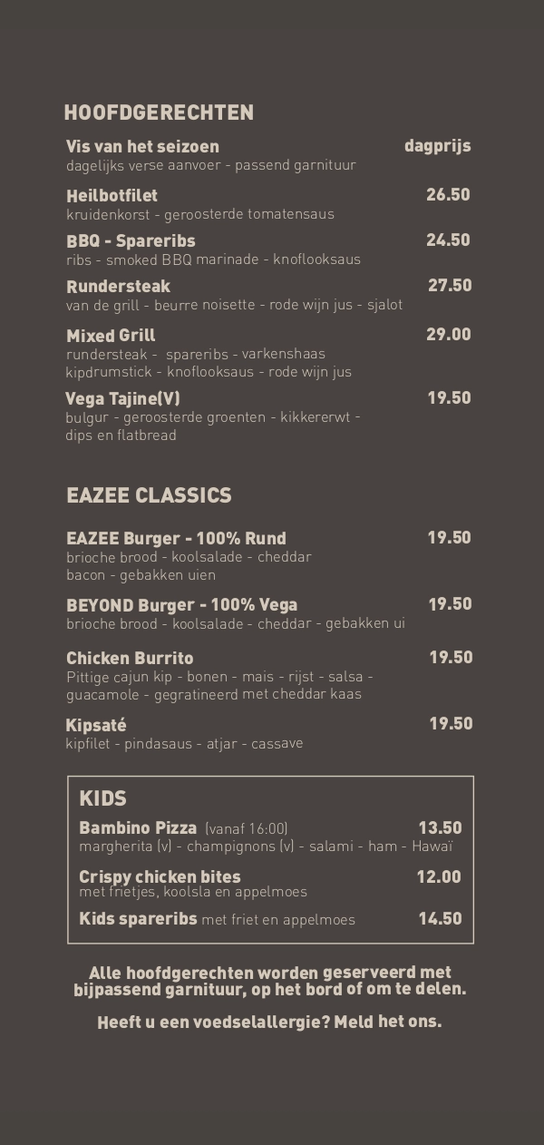 Alle gerechten op onze menukaart zijn de gehele dag te bestellen vanaf 12:00.